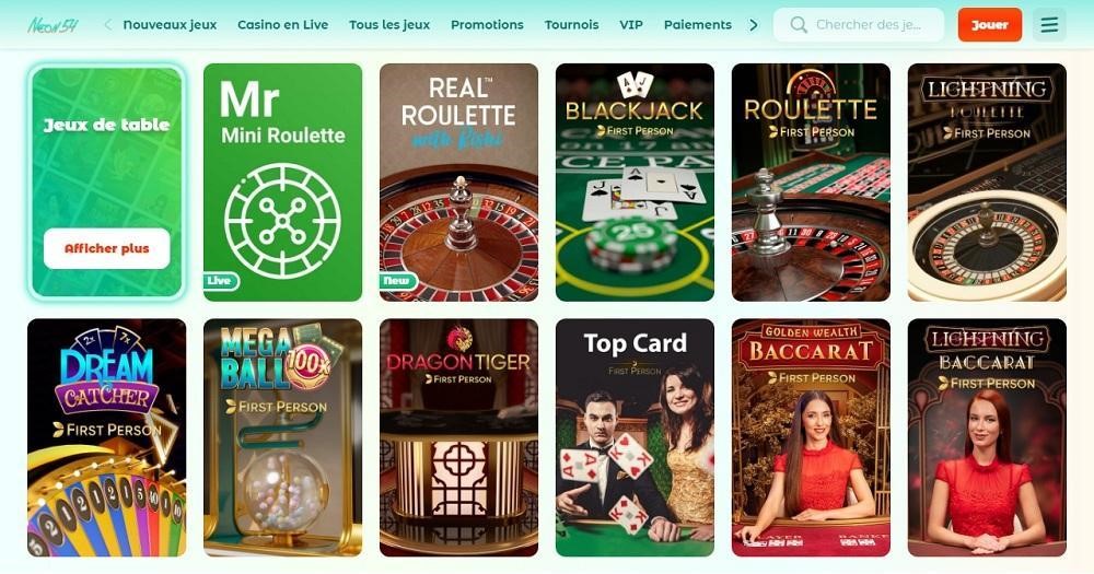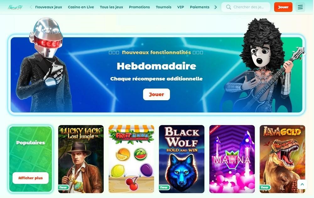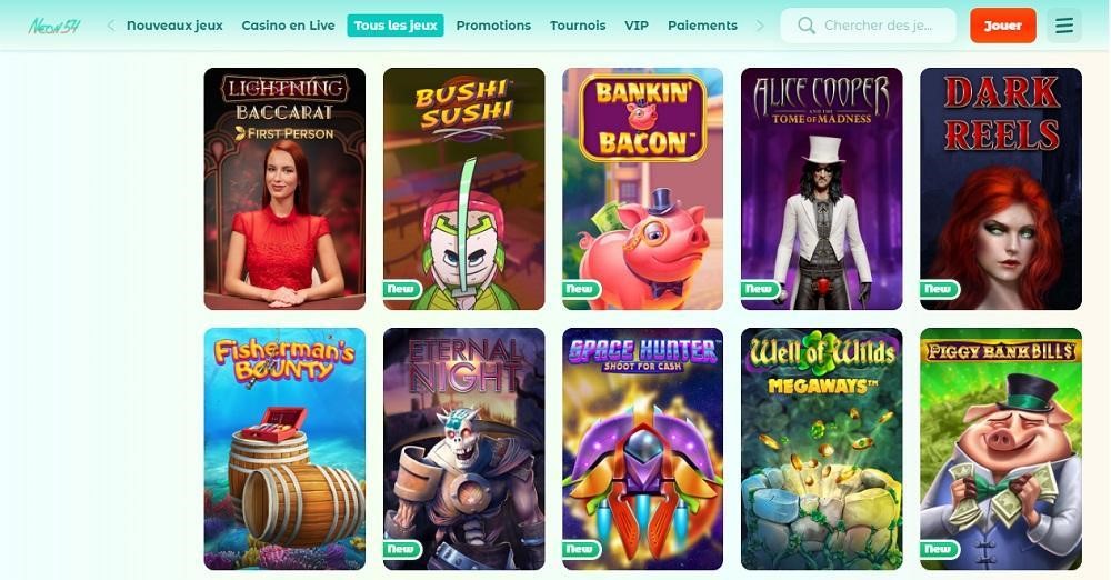Neon54 héberge différentes catégories de jeux incluant les titres de casino classique et les jeux en direct. Il fonctionne exclusivement en ligne et s’adapte parfaitement aux plateformes mobiles. Vous pourrez l’exploiter sans téléchargement et sans installation.